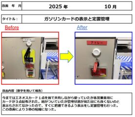今回ご紹介するのは、営業車で使用するガソリンカードの「表示と定位置管理」の改善事例です。 今回の取り組みも、まさに「カイゼン」の精神が息づく素晴らしい事例ですね。 一見すると小さな変更かもしれませんが、 この事例には […]